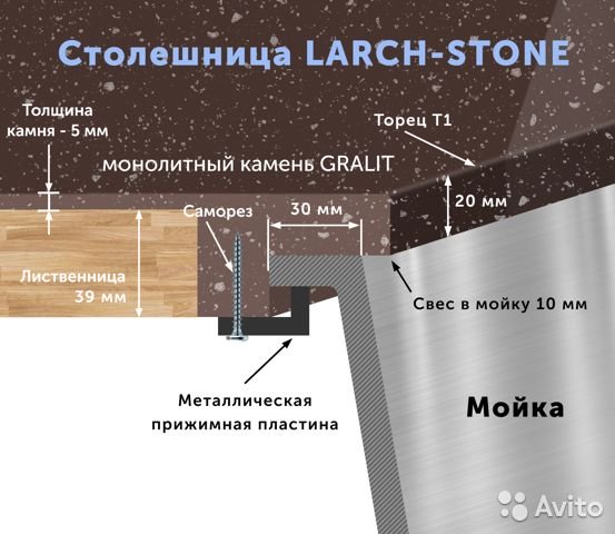 ? Столешница по технологии LARCH-STONE покрыта монолитным камнем Gralit, толщиной 5 мм.